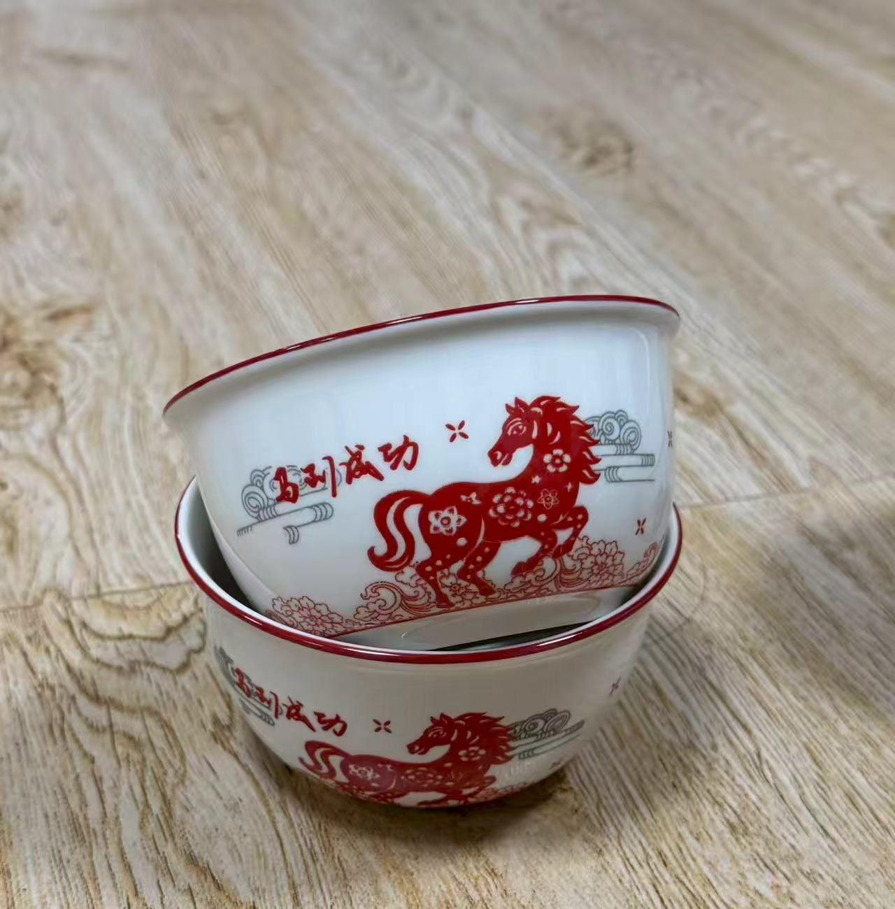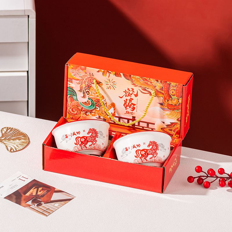 2碗套装:规格:25*6*12.5cm、466g, 外箱尺寸:52×32×63CM 27kg、 配法:2碗 产品特点: 马年窗花碗礼,把新春福气捧在手心,当马年的祥瑞遇上传统剪窗花工艺,这组碗具礼盒便成了新春里别致的心意。那碗身的骏马剪纸,红得热烈又鲜活,似是从民俗窗花里跃出,带着“马到成功”的美好祈愿,将年节的红火与祝福都盛了进来。无论是自家添新岁,还是赠予亲友贺新春,这一份融了传统剪纸艺术与马年吉兆的礼,都能让年味在餐桌间,在心意里,悄然升温。