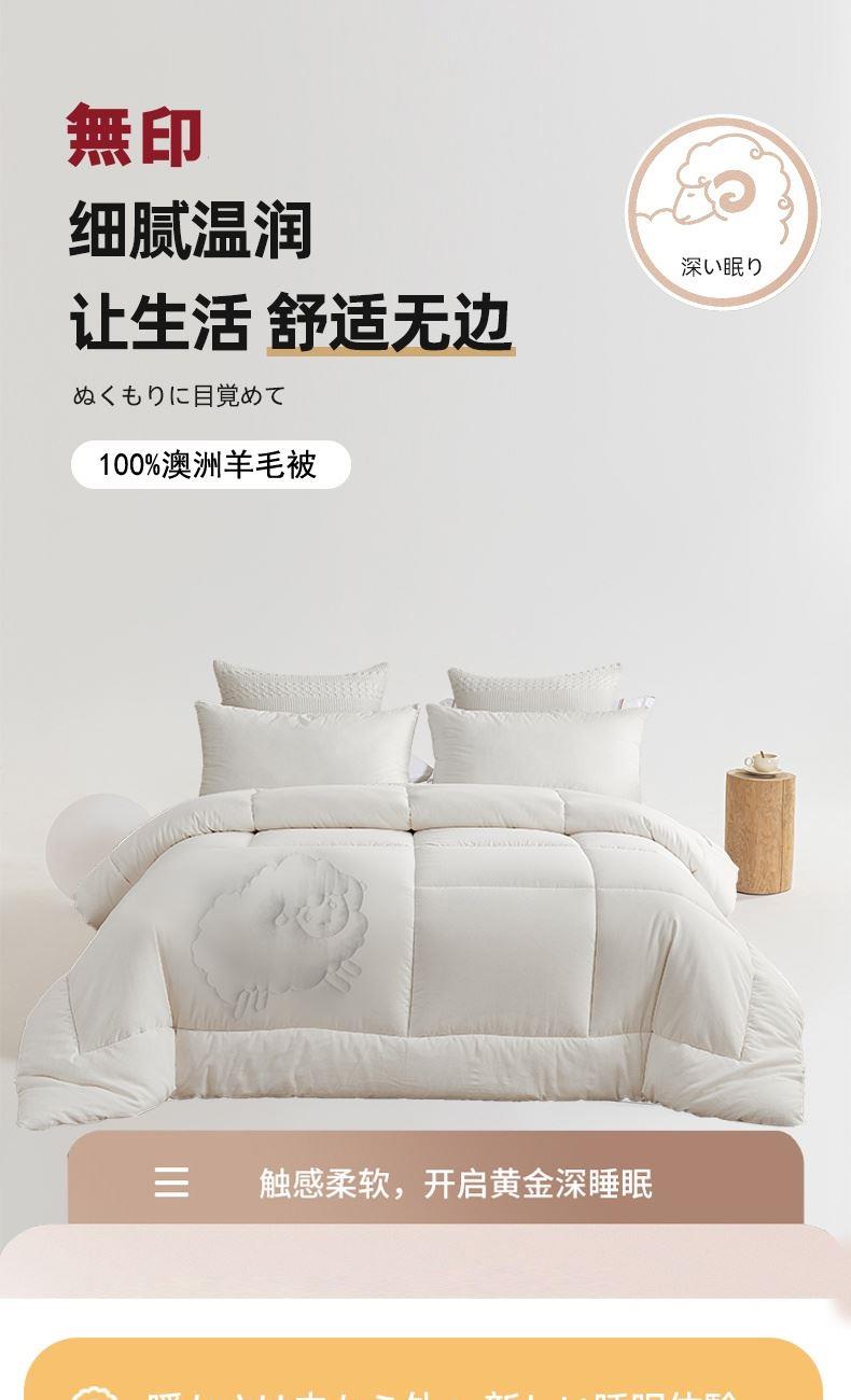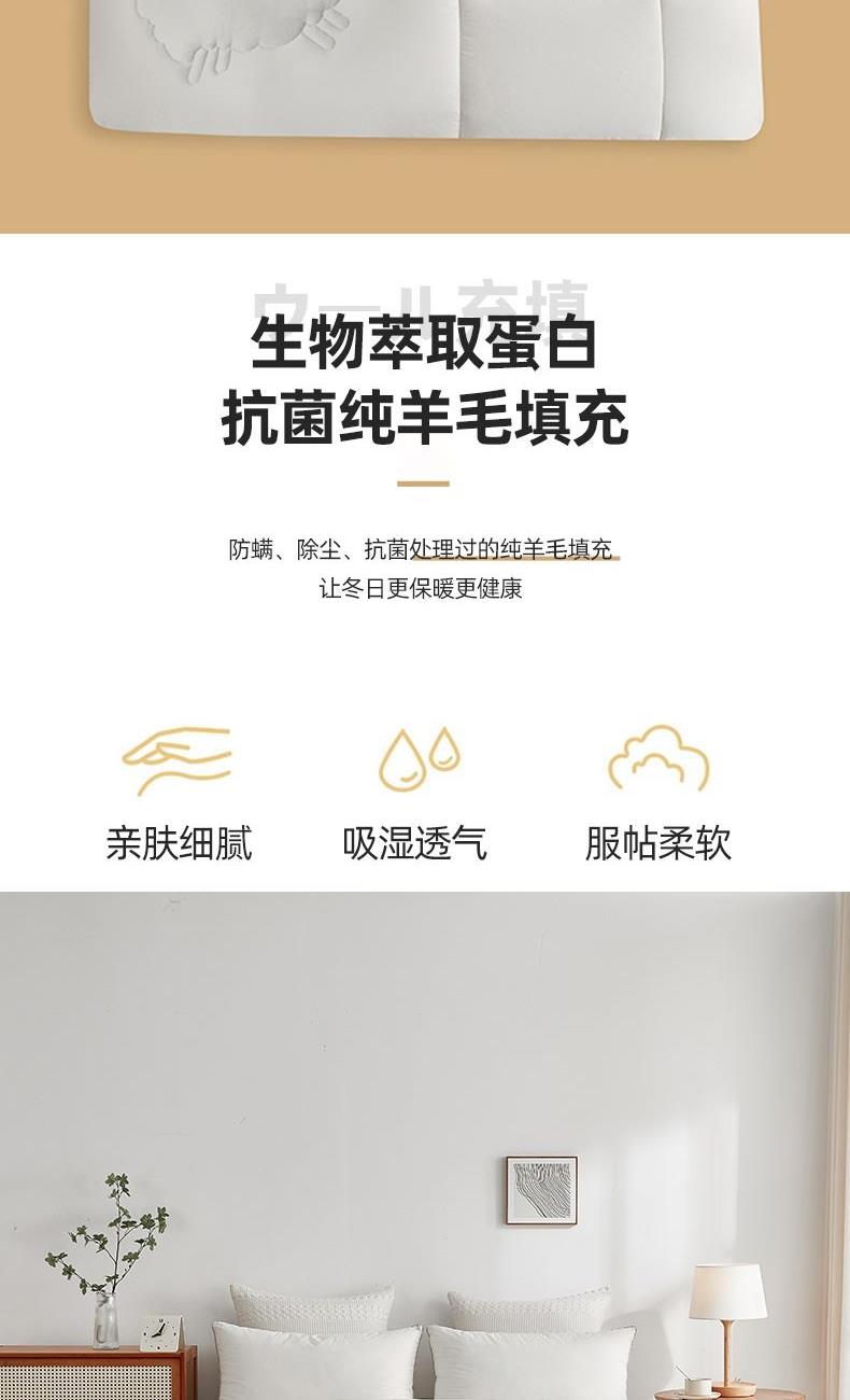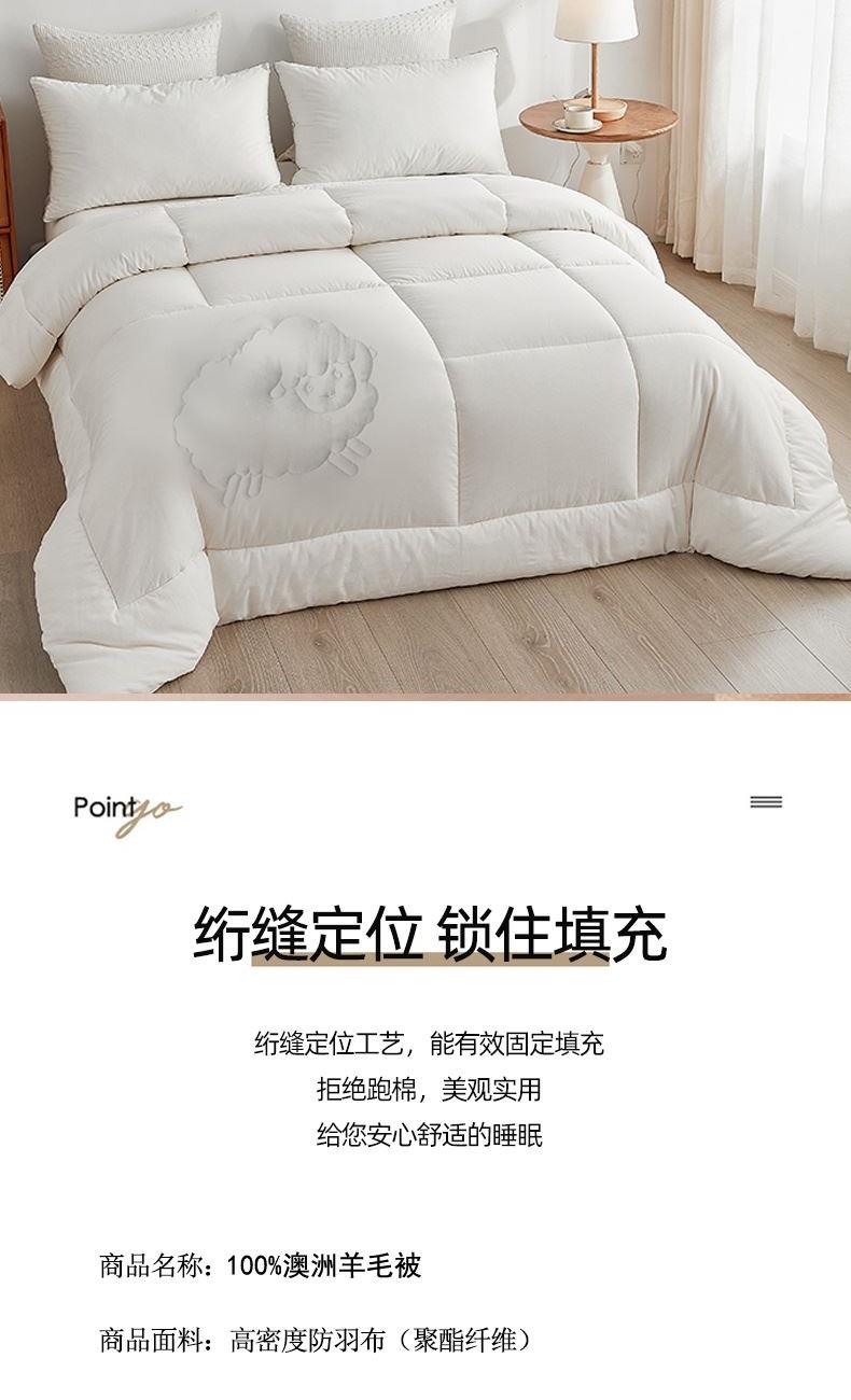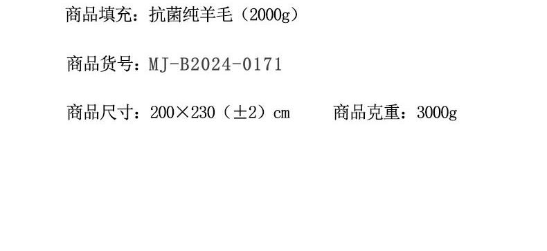 规 格:200×230(±2)cm 克 重:3000g 面 料:高密度防羽布 填 充:羊毛 高密度/防钻毛/抗静电的高密防羽布,对绒类产品的极度亲护. 防螨,除尘,处理过的纯羊毛填充,让冬日更保暖更健康。 高品质、高材质、高标准,一款对生活高度负责的产品