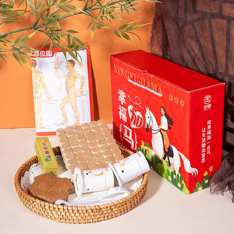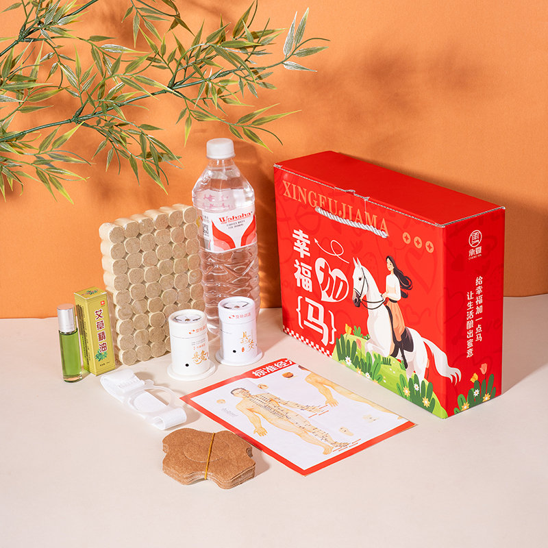 产品配置:人体穴位图*1 艾草精油10ml*1 艾柱54粒*1 悬灸仪*2 悬灸胶贴*20 固定绑带*1 幸福加马彩盒*1个