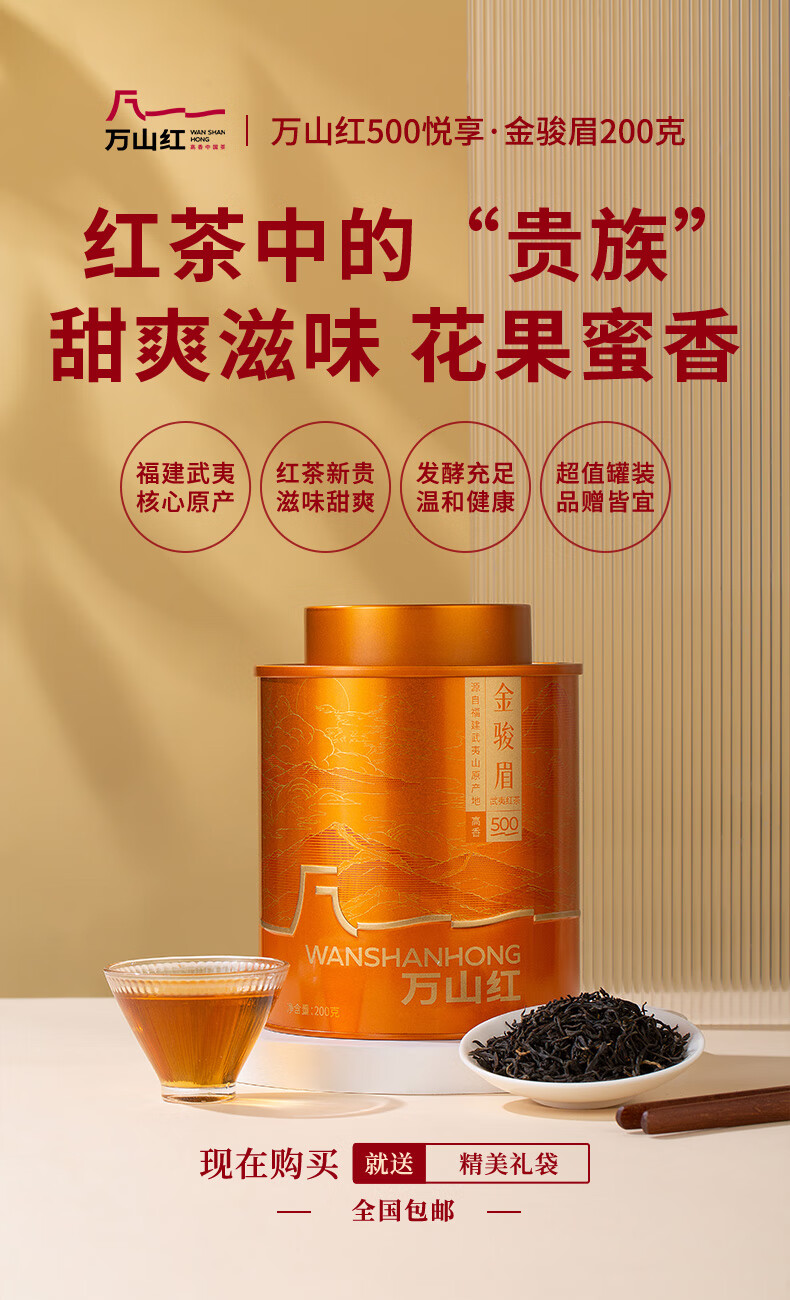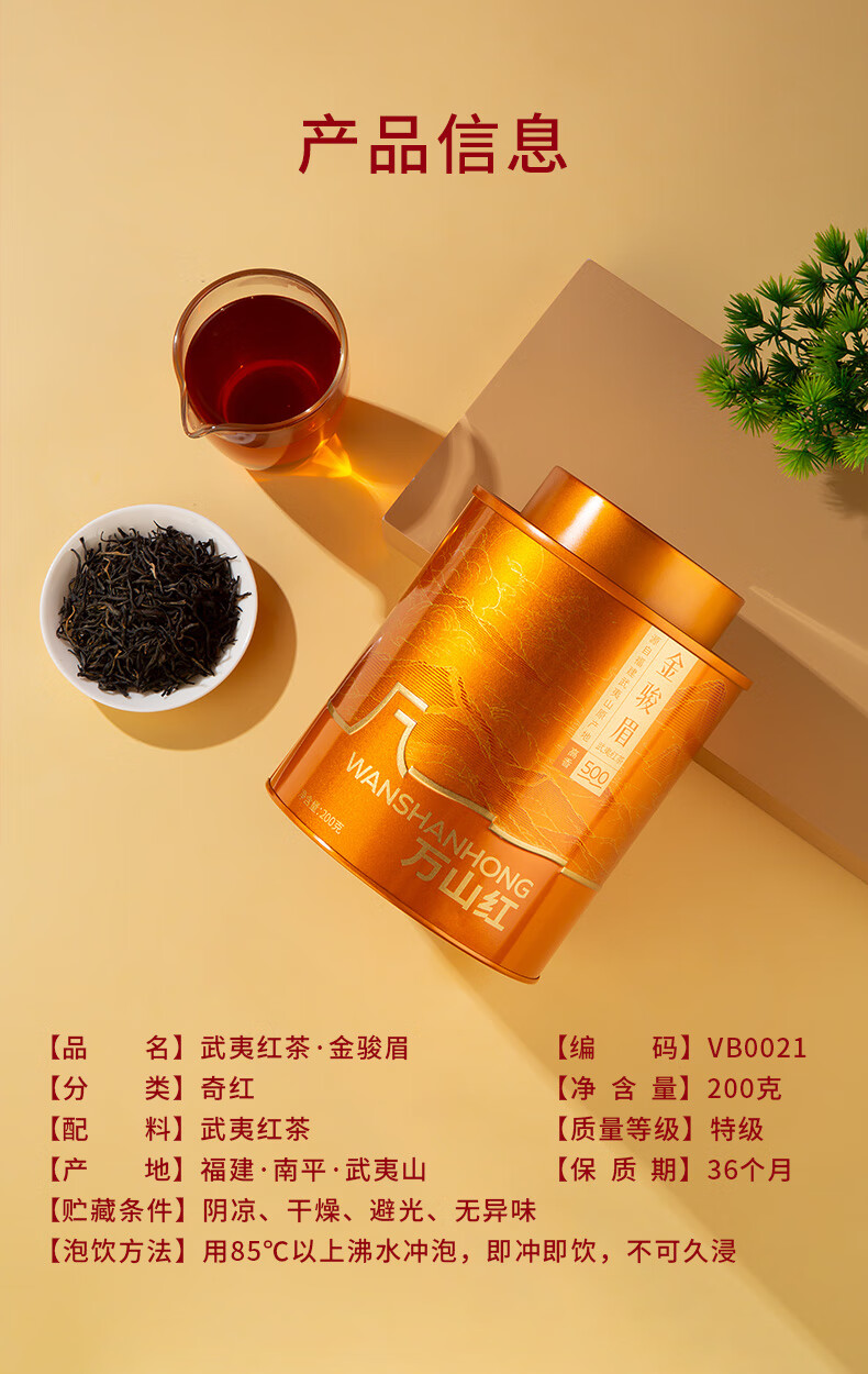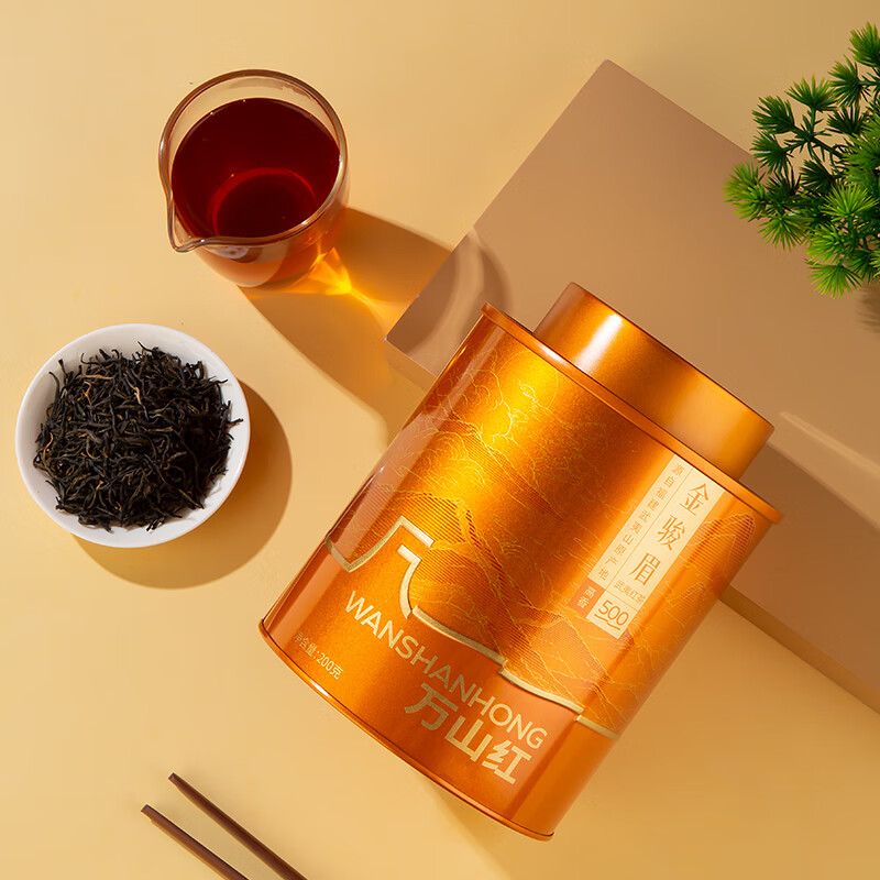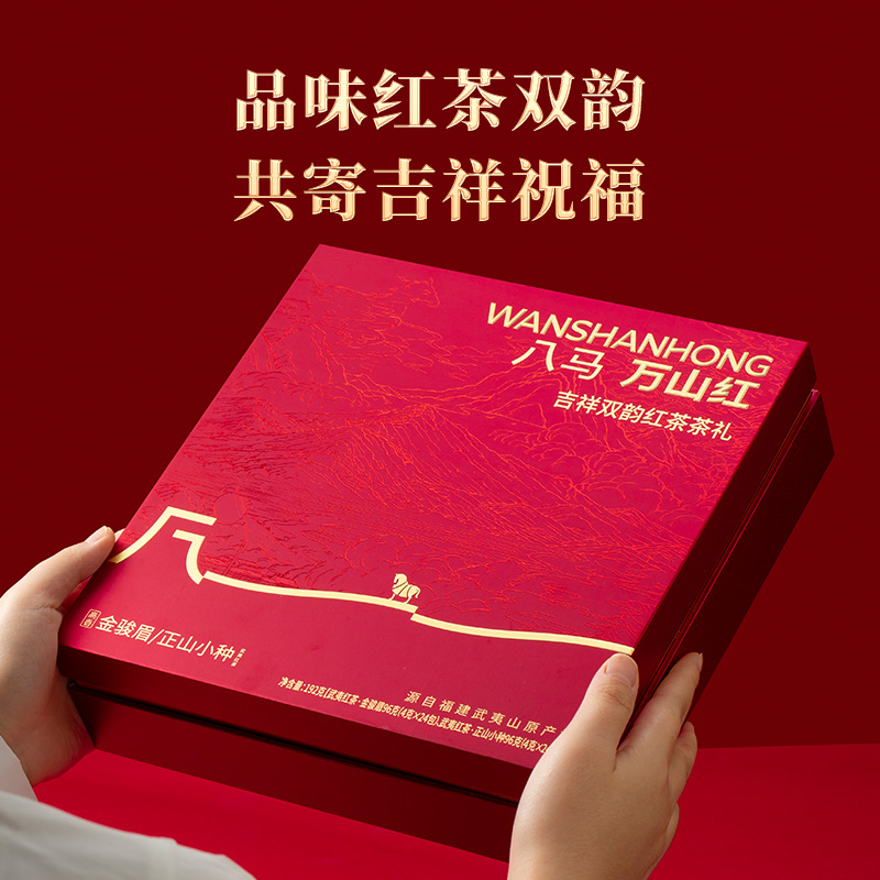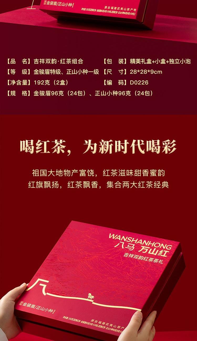 礼盒内配: 特级金骏眉96克(24包) 一级正山小种96克(24包) 净含量:192克 单罐内配: 金骏眉200克 净含量:200g 推荐理由: 自饮一罐,送礼一盒 - 源自福建武夷山原产地,拥有正宗武夷红茶基因,产地优势显著。 - 涵盖金骏眉和正山小种两大经典武夷红茶品类,满足不同红茶爱好者需求。 产品品质与风味 - 金骏眉呈现花果蜜香,滋味醇厚甘甜,香气层次丰富。 - 正山小种则具传统红茶的醇厚口感,香气浓郁持久,口感饱满。 - 包装设计精美,既有单罐(200克装)的精致实用,也有“吉祥双韵红茶茶礼”礼盒装,红金配色尽显大气,适配自饮与送礼场景,下单还赠专属礼袋,提升礼品质感。