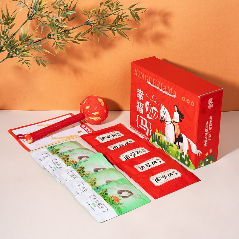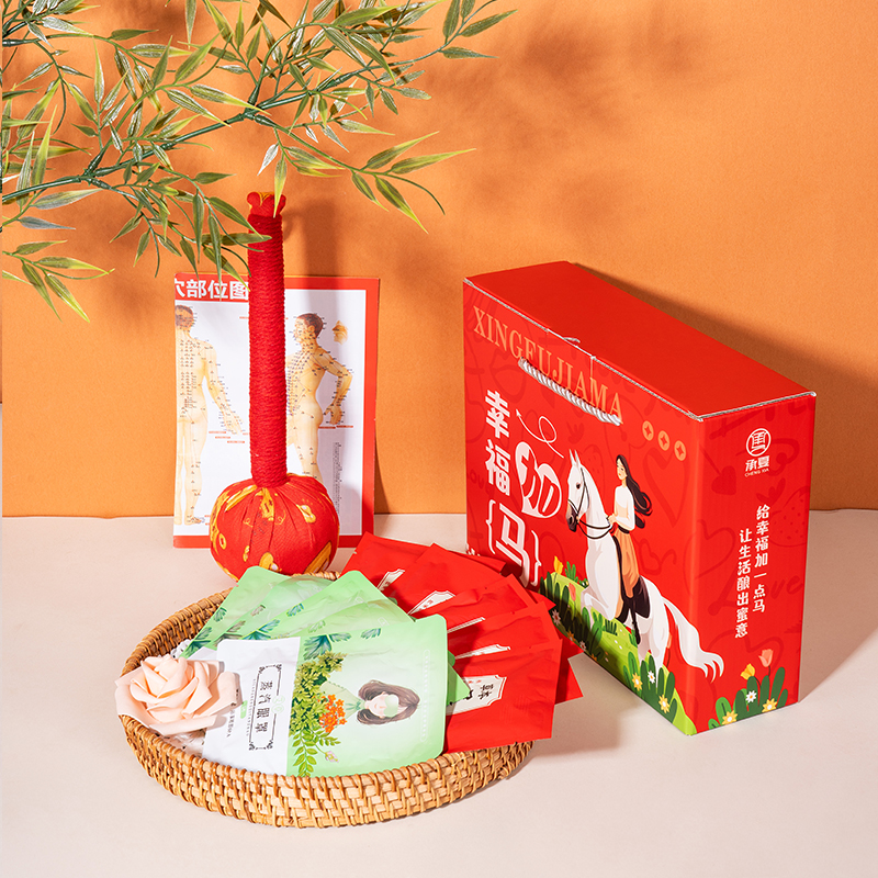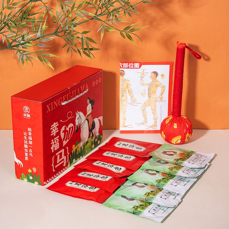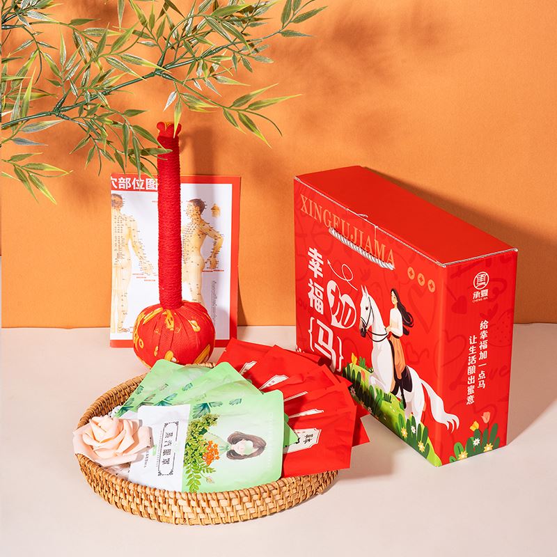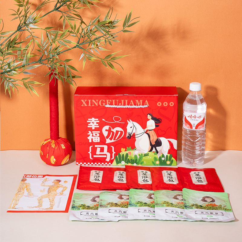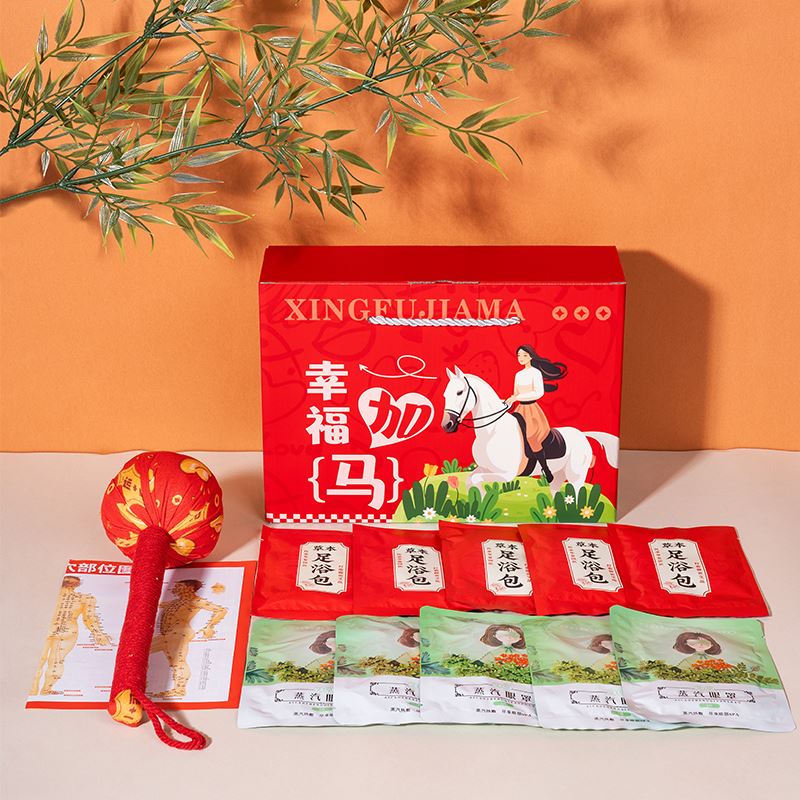 礼盒规格:270*80*200mm 产品配置:元宝艾草养生锤26cm*1 草本足浴包20g*5 人体穴位图*1 艾草蒸汽眼罩*5 幸福加马彩盒*1个 推荐理由: 1、主题“幸福加马”,谐音幸福加码,送给客户加倍的幸福,马年马元素,为开门红、新年助力。 2、艾草锤定制中国红金元宝面料,专属财运+1的美好祝福,填充多味本草,艾在手上,锤出安康,锤内填充多个金光闪闪的小金元宝,锤走烦恼,迎来财气。 3、精美彩袋十二味草本足浴包,每袋20g,养生泡脚效果好。 4、艾草蒸汽眼罩,每天睡前20分钟,温润呵护,缓解视疲劳,改善眼周纹路,安神助眠。 5、特别搭配穴位图,穴位养生,效果更佳。