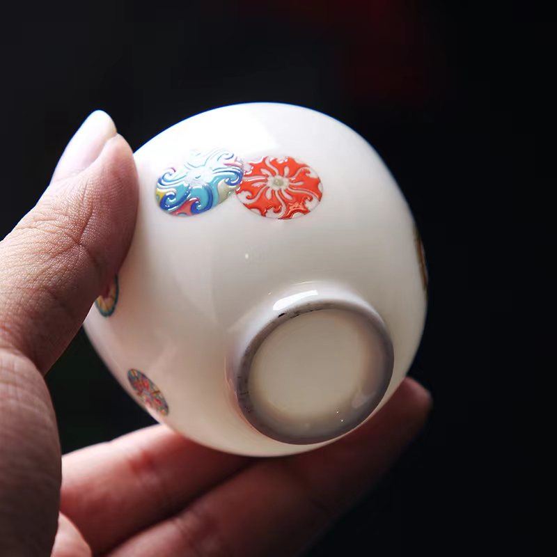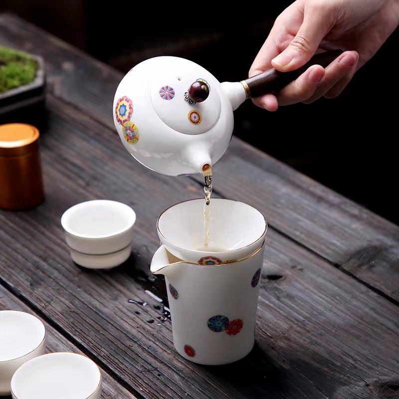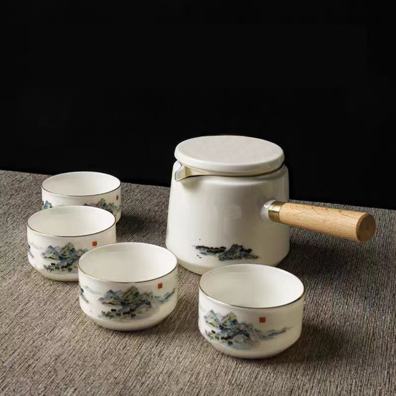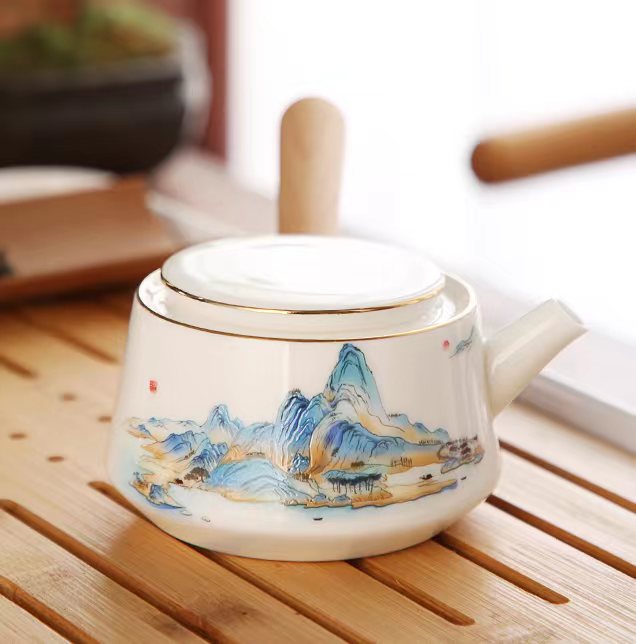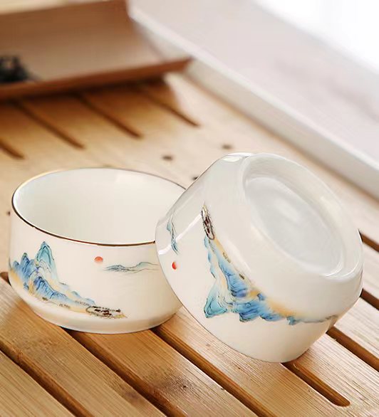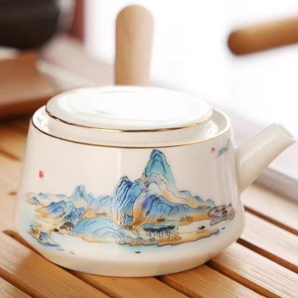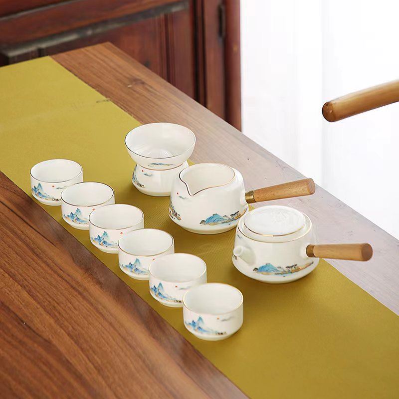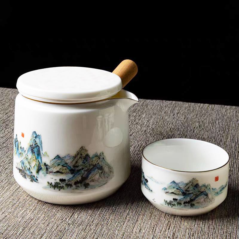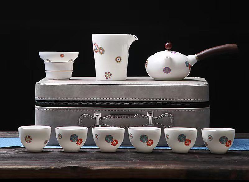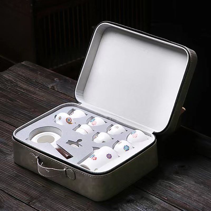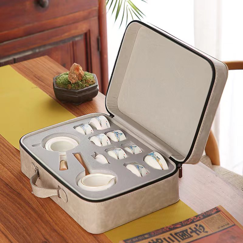 鹏翼千里江山羊脂玉瓷皮包茶具套装