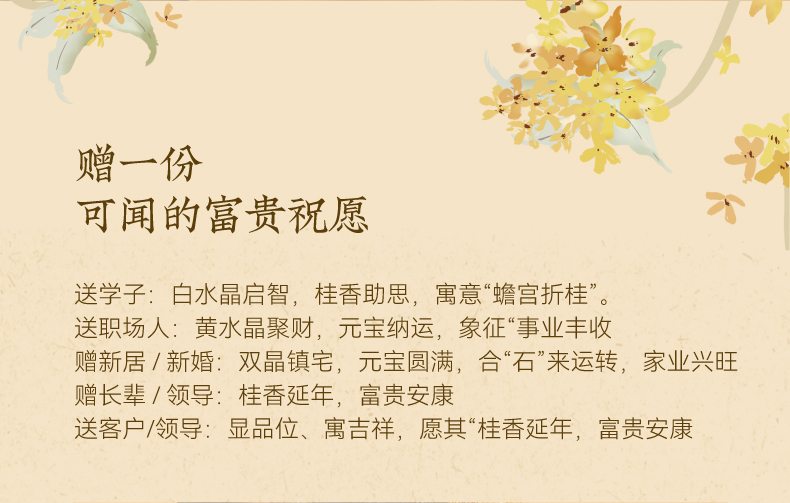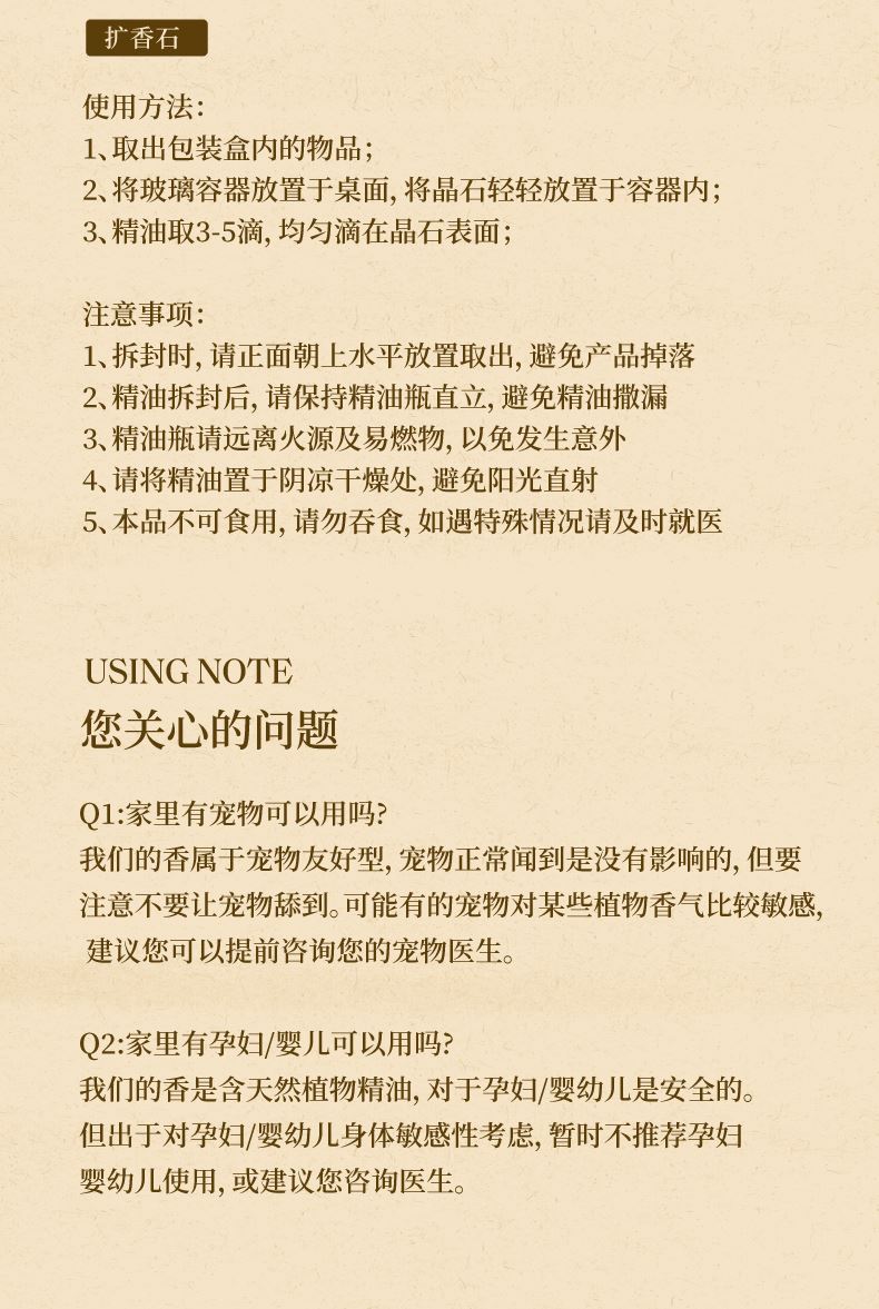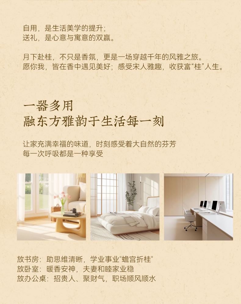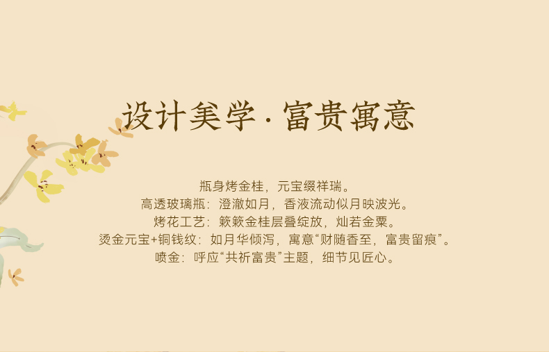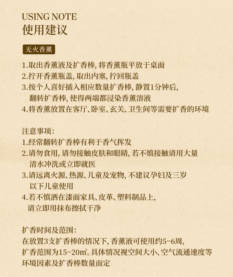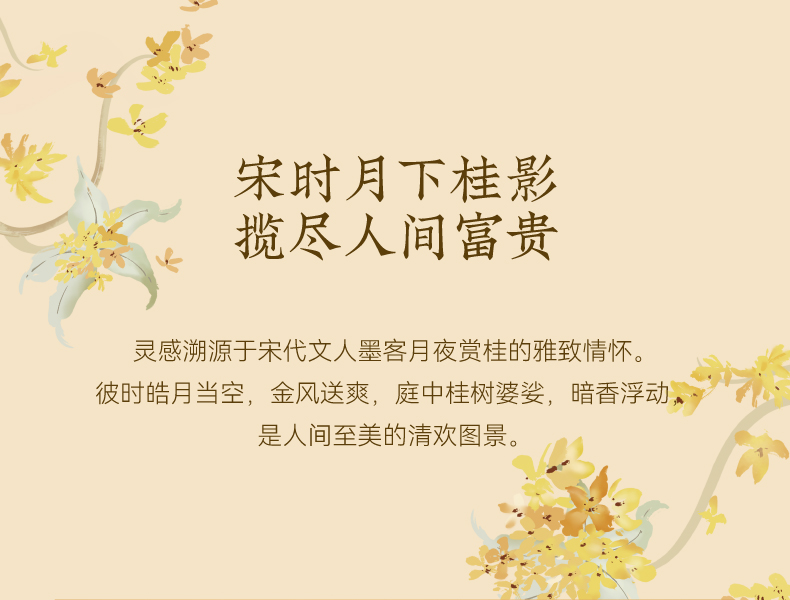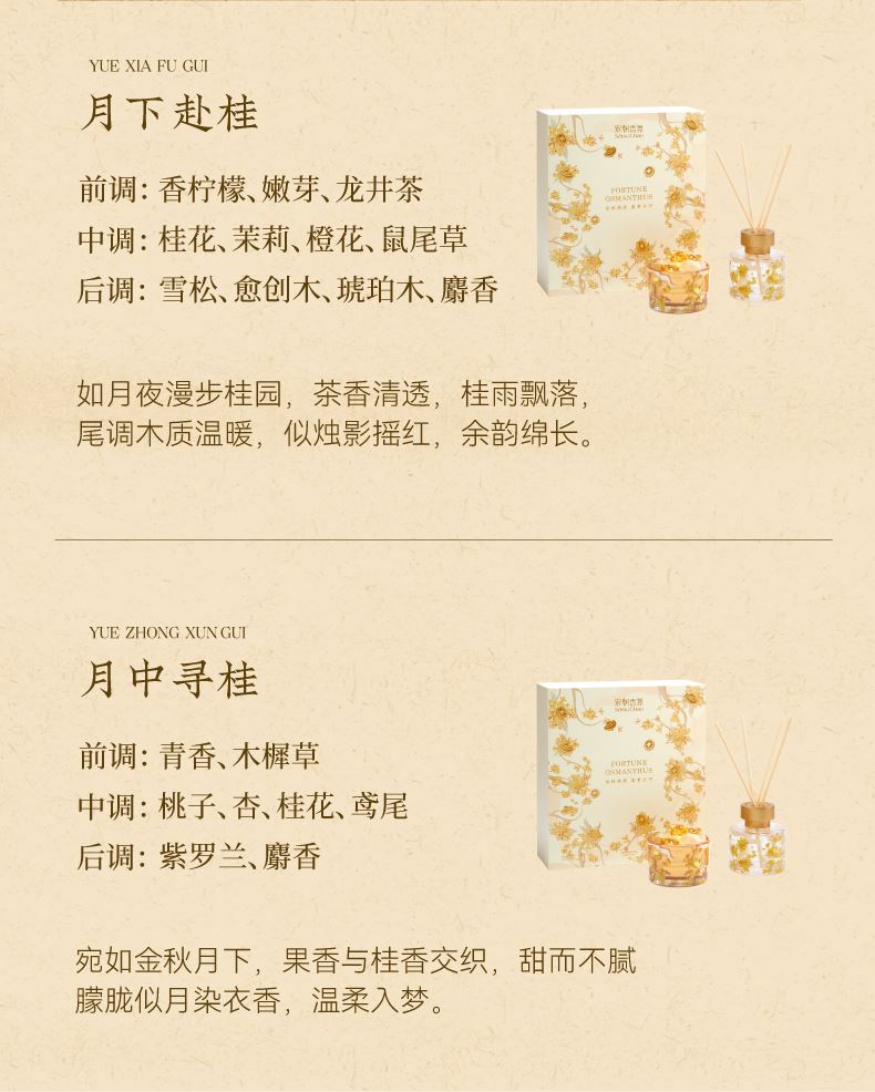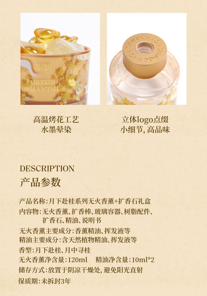 【规格】无火香薰净含量:120ml+精油净含量: 10mI*2 【香型】月下赴桂(复合型桂花香)、月中寻桂(还原型桂花香) 【生产日期】见包装喷码 【保质期】未拆封3年 【储存方法】请置于阴凉处,避免阳光直射