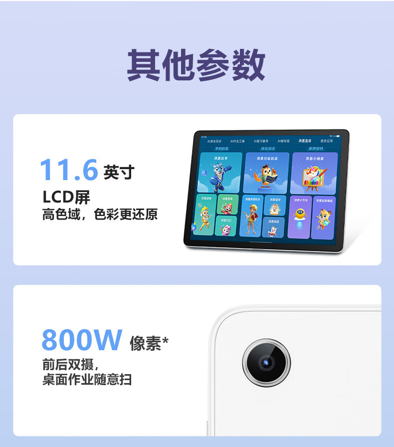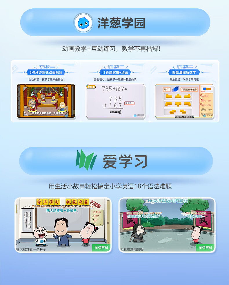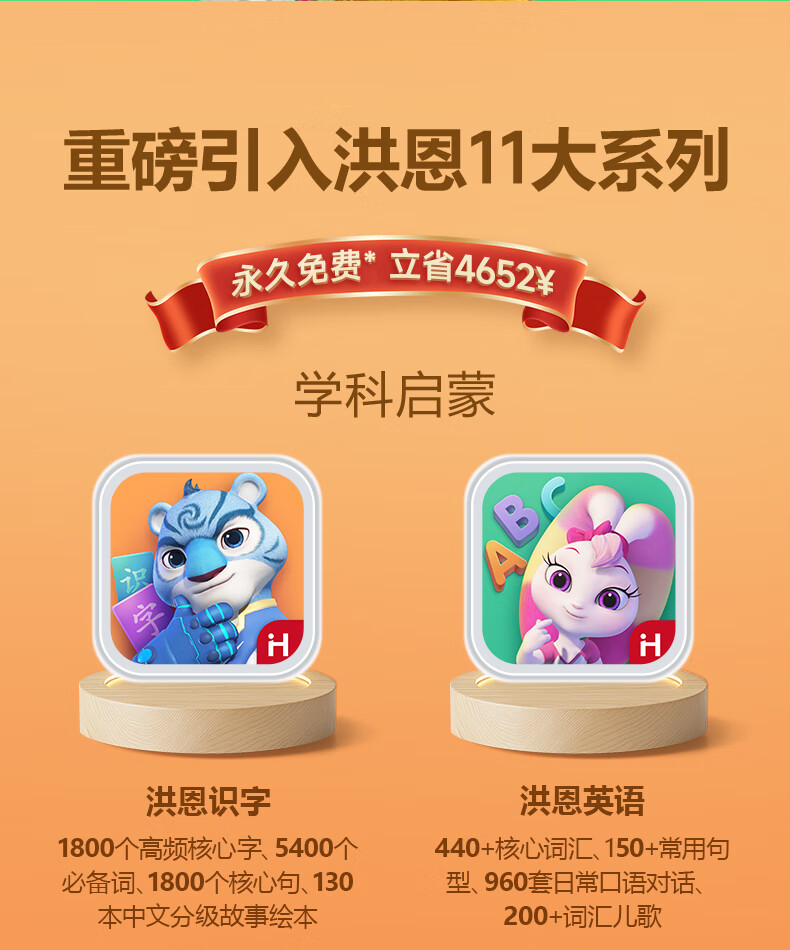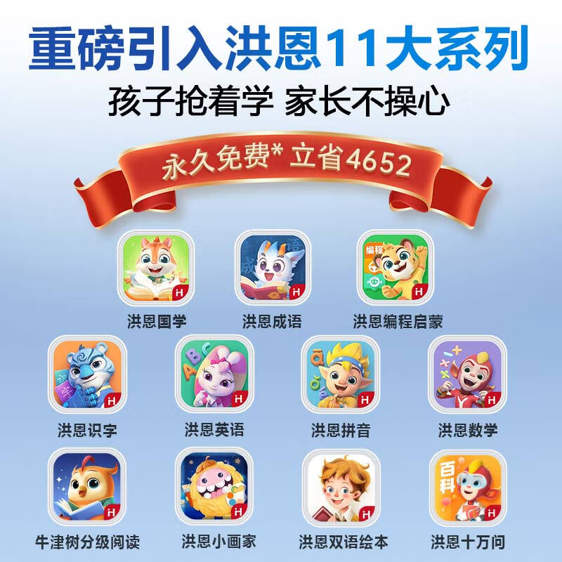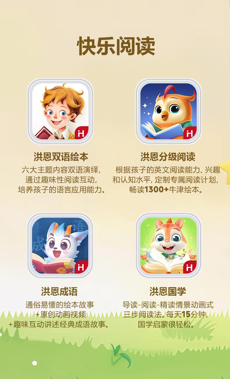 洪恩8大系列【终生免费】 洪恩识字;洪恩拼音;洪恩ABC;洪恩双语绘本;洪恩分级阅读;洪恩思维;洪恩小画家;洪恩十万问; 5大能力素养模型:社会力,语言力,思维力,创造力,认知力;“5P玩中学”早教体系通过益智游戏和学习互动,分龄分段引导孩子”乐中启智“、”玩中创造“,系统构建武大能力素养模型; 全国官方正版教材覆盖95%以上,同步AI互动课,学透新教材,领跑新学期;针对孩子不同学习能力,构建”同步-专项-培优“课程分层体系;全智能作业辅导(定时长、讲难题、批作业、练错题、刷考题);家长管控,一键防沉迷,学习情况一目了然