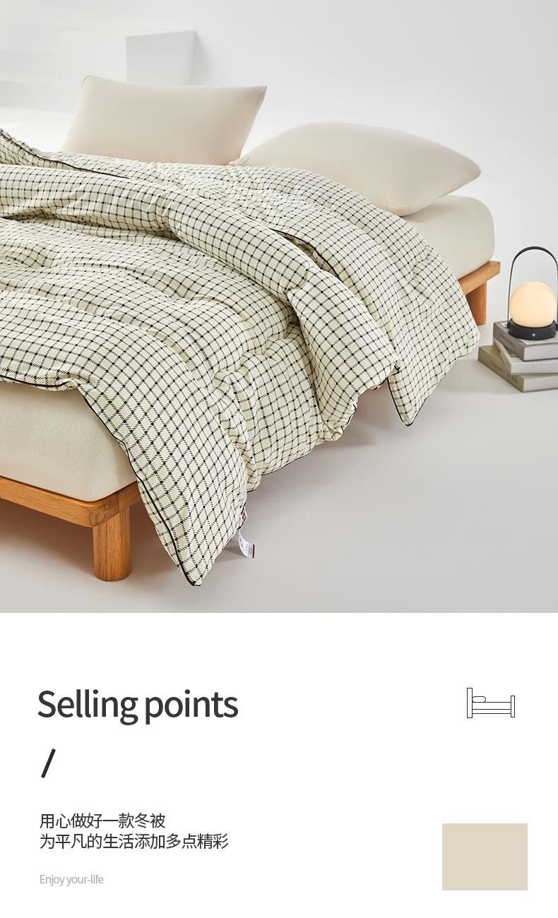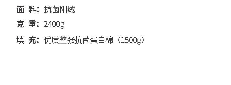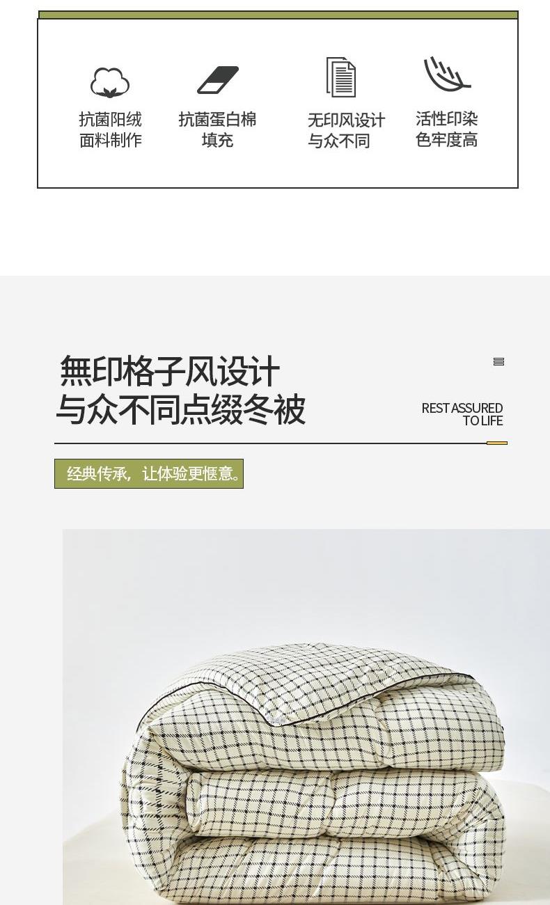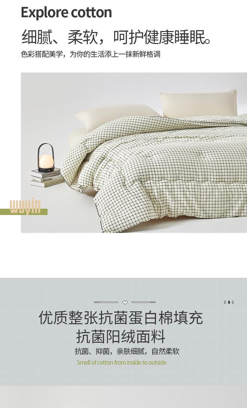 规 格:200×230(±5)cm 克 重:2400g 面 料:阳绒 填 充:优质整张蛋白棉(1500g) 阳绒面料,细腻、柔软,呵护健康睡眠。 优质整张蛋白棉填充,有机,丝滑,冬日更贴心的呵护。 無印格子风设计,经典,让体验更惬意