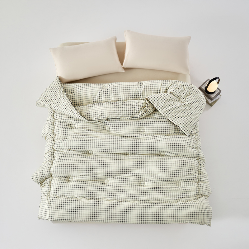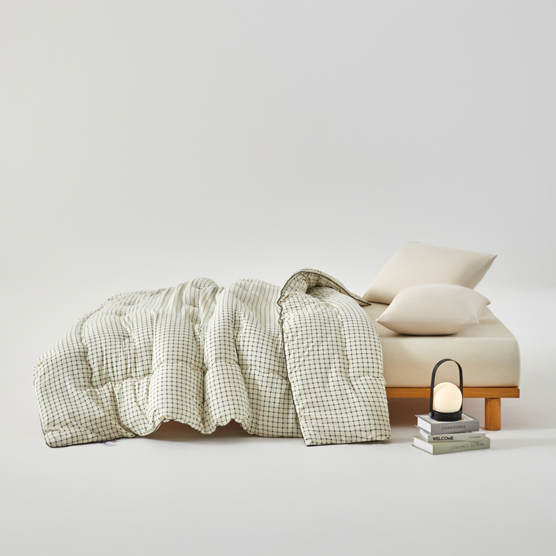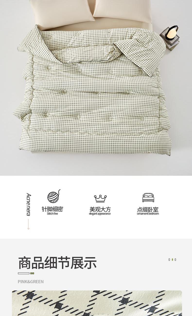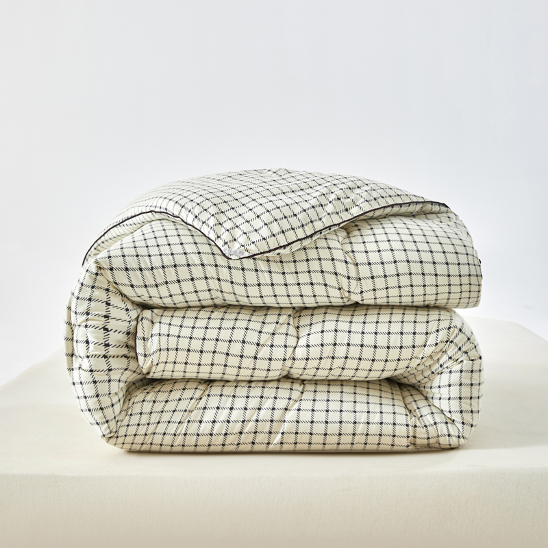 规 格:200×230(±5)cm 克 重:2400g 面 料:阳绒 填 充:优质整张蛋白棉(1500g) 阳绒面料,细腻、柔软,呵护健康睡眠。 优质整张蛋白棉填充,有机,丝滑,冬日更贴心的呵护。 無印格子风设计,经典,让体验更惬意