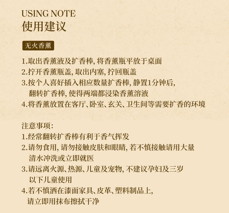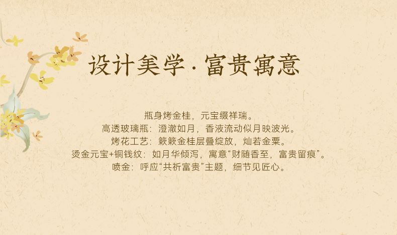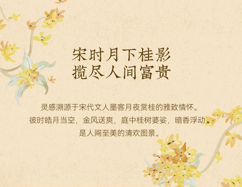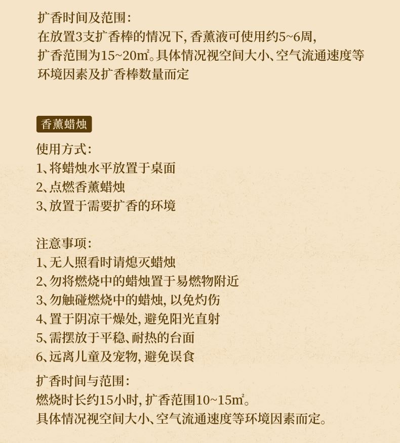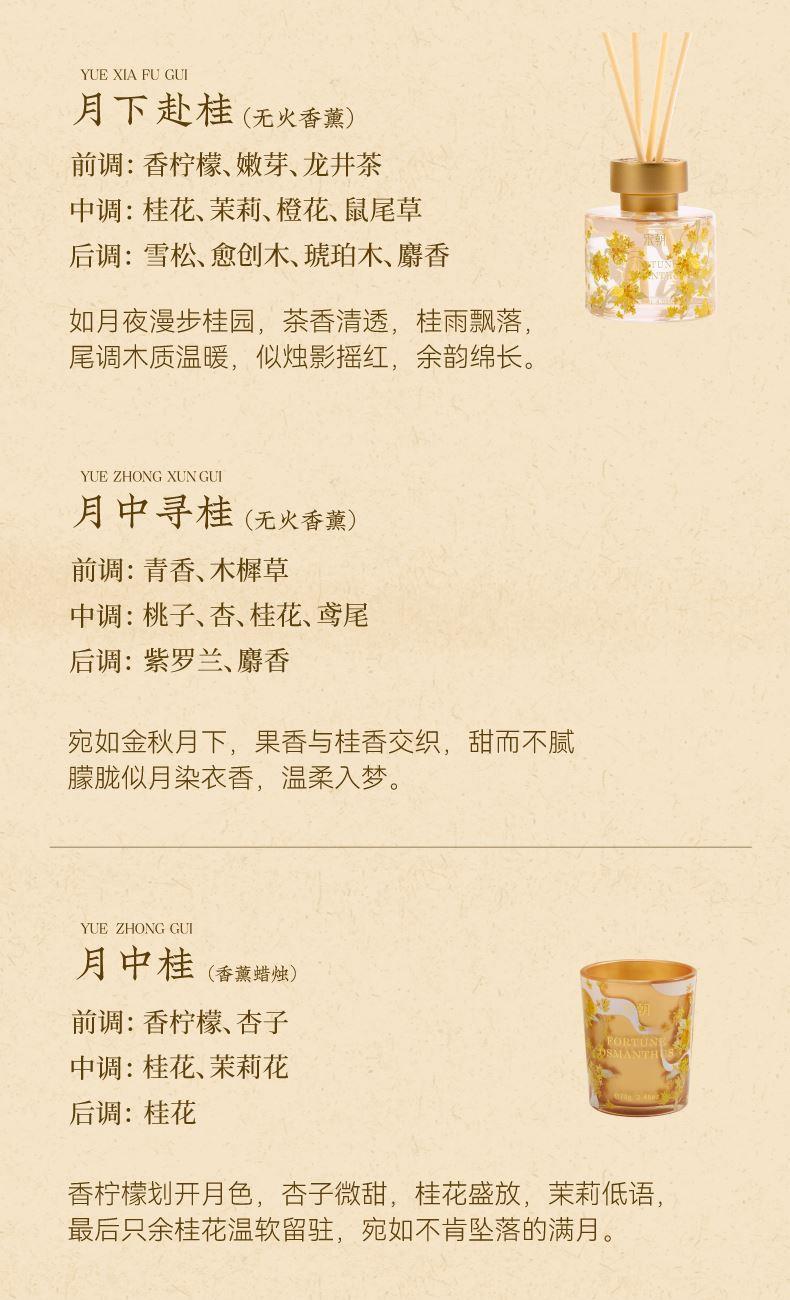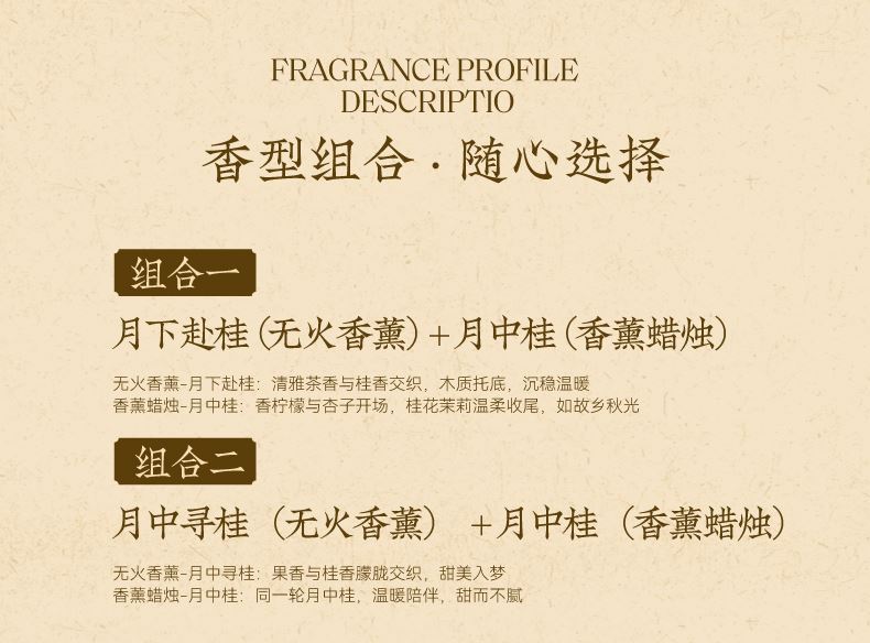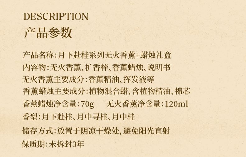 【规格】无火香薰净含量:120ml+香薰蜡烛:70g 【香型】月下赴桂(复合型桂花香)、月中寻桂(还原型桂花香) 【生产日期】见包装喷码 【保质期】未拆封3年 【储存方法】请置于阴凉处,避免阳光直射